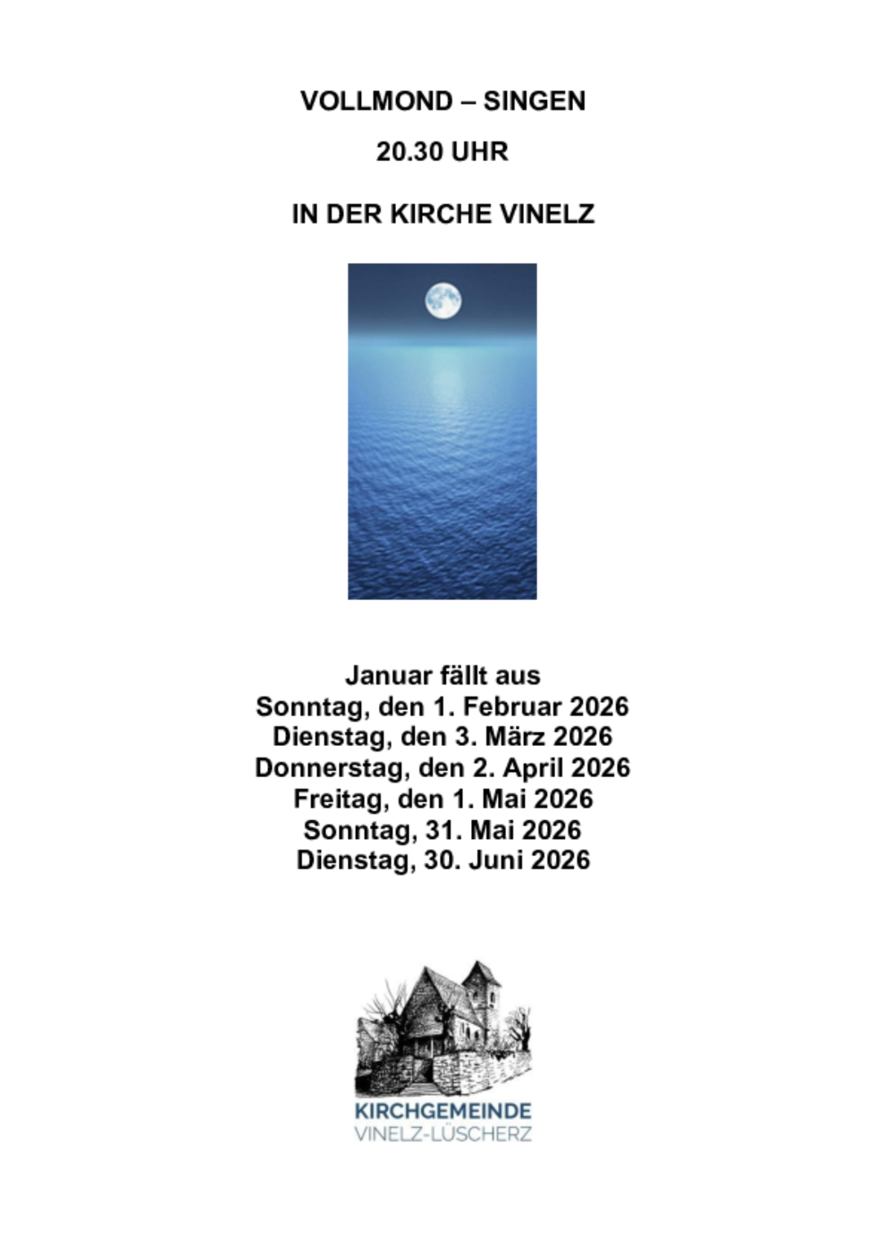 Vollmond Singen in Vinelz um 20.30 Uhr in der Kirche.